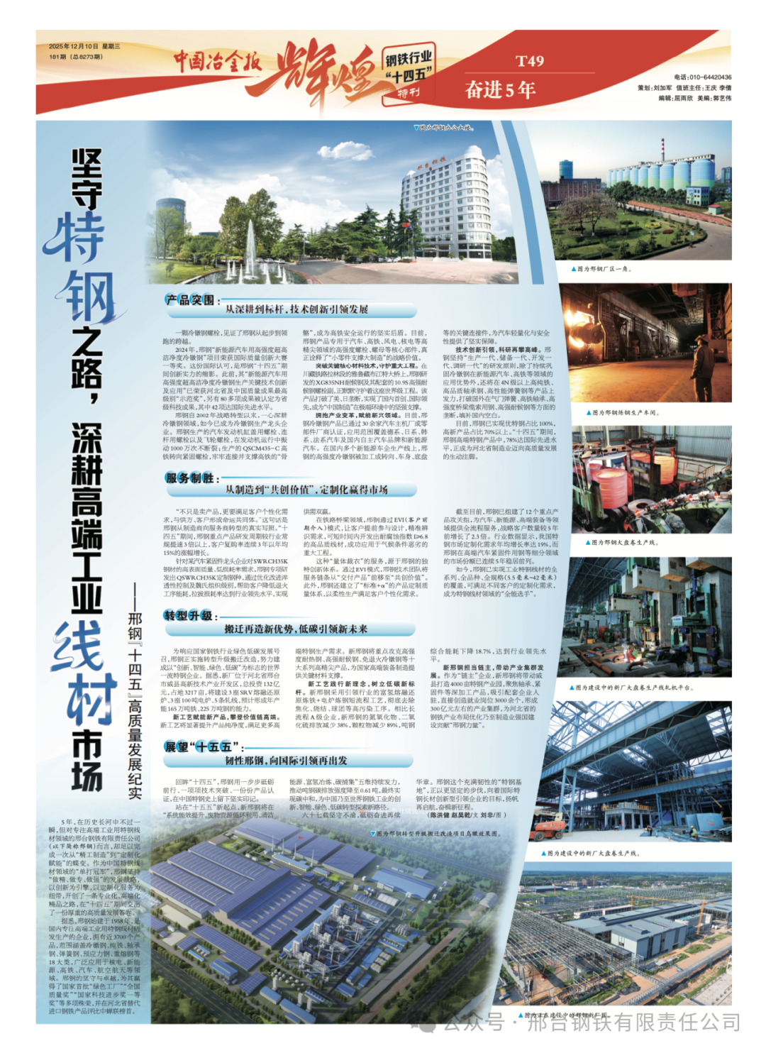 5年,在歷史長河中不過一瞬,但對專注高端工業(yè)用特鋼線材領(lǐng)域的邢臺鋼鐵有限責(zé)任公司(以下簡稱邢鋼)而言,卻足以完成一次從“精工制造”到“定制化賦能”的蝶變。作為中國特鋼線材領(lǐng)域的“單打冠軍”,邢鋼堅持“做精、做專、做強”的發(fā)展戰(zhàn)略,以創(chuàng)新為引擎,以定制化服務(wù)為紐帶,開創(chuàng)了一條專業(yè)化、高端化精品之路,在“十四五”期間交出了一份厚重的高質(zhì)量發(fā)展答卷。